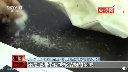 南通市纤维检验所高级工程师 钱薇薇:这条被子,它给消费者看的这个看样,看上去还是蛮不错的绒子,但其实这条被子里面的填充物,大多数都是这种粉碎性的毛绒。