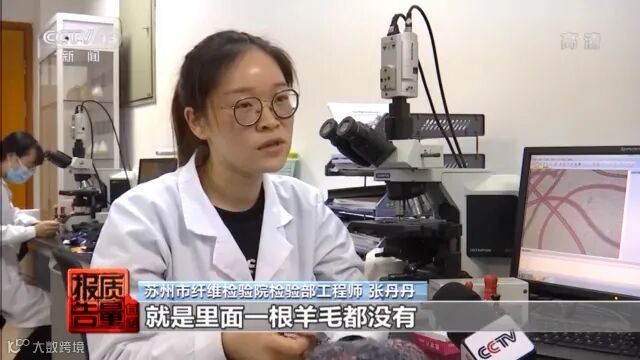 苏州市纤维检验院检验部工程师 张丹丹:这条围巾它吊牌上显示的是96%的羊毛,但是我们实测下来,它是100%聚酯纤维,就是100%涤纶,就是里面一根羊毛都没有。
