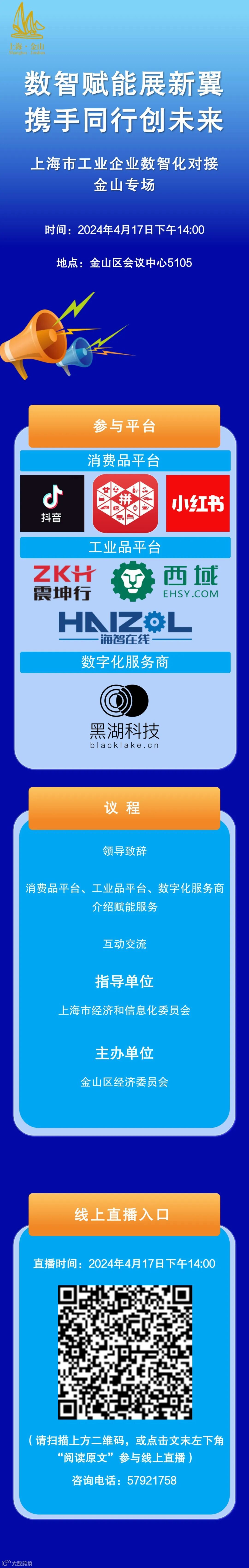 【直播预告】“数智赋能展新翼 携手同行创未来”上海市工业企业数智化对接金山专场活动