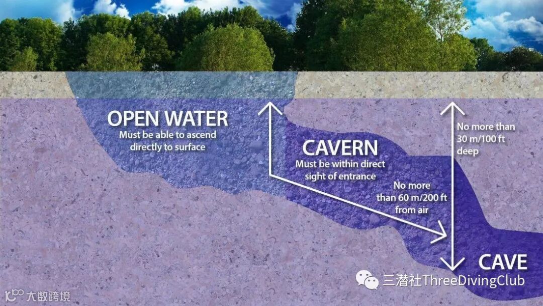 Cavern Diving 和 Cave Diving,两个字母之差,区别很大。Cavern还是属于休闲潜水的范畴,要求深度不超过30米,渗透不超过60米且在自然可见光能照射的洞穴中进行潜水,目的就是为了保证潜水的安全---能直接回到水面上。