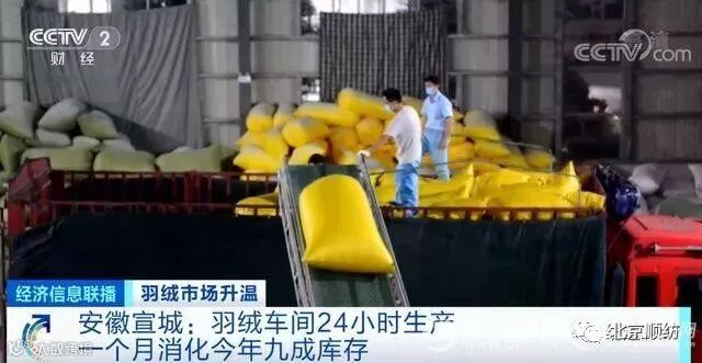 安徽宣城:羽绒车间24小时生产一个月消化今年九成库存在羽绒服中,羽绒是重要的原材料,羽绒制品销售向好,原材料羽绒价格近期出现了哪些变动,对于羽绒制品生产企业又有哪些影响呢?记者宋佳音:这里是安徽宣城的一个羽绒生产车间,身后是自动化的羽绒加工设备,经过原毛粗分、水洗、精分之后,一袋袋羽绒成品就会从这里出货,工作人员告诉我,这一包大概有25公斤,这个车间每天能生产400多包这样的羽绒,大概可以做六万多件羽绒服。