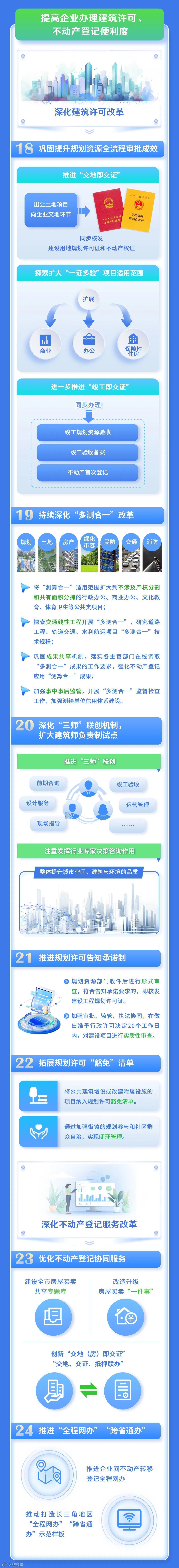 市规资局、市发展改革委介绍,为认真落实《上海市优化营商环境条例》《上海市坚持对标改革 持续打造国际一流营商环境行动方案》,持续打造市场化、法治化、国际化一流营商环境,更好服务上海“五个中心”建设和城市核心功能提升,结合我市规划资源管理实际,市规划资源局制定了《坚持对标改革 持续打造规划资源领域一流营商环境实施方案》。《方案》包括优化规划土地和不动产登记管理,提升政务服务质量和信息透明度,提高企业办理建筑许可、不动产登记便利度,优化市政公用设施服务,加强重点区域、重点领域创新引领等方面内容。来看图解↓