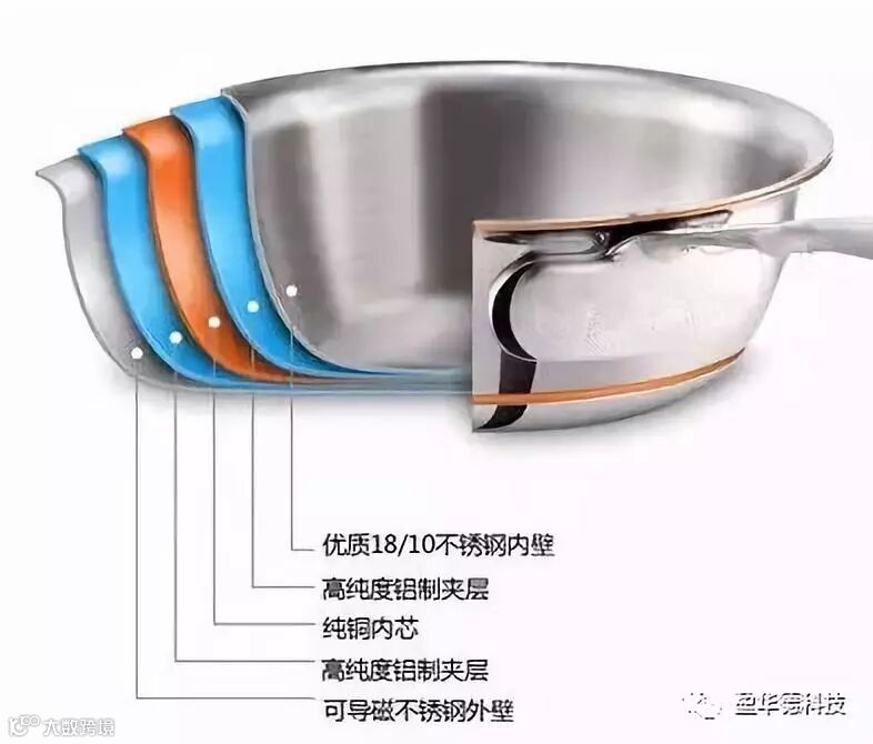 除了单一材质的锅之外,市面也有很多多层次的锅,这种锅的设计理念主要是考虑到不锈钢导热性差,但是不容易生锈又好打理。而铜和铝合金的导热性很好,二种或多种材质结合在一起,充分发挥各自的优良特质,更因其热传导性好,受热均匀,即使不加涂层也能在一定程度实现不粘效果。常见的多层次锅有三层(钢、铝、钢)、五层(钢、铝、铜、铝、钢)等,外表差别不打,但拿上手就能感受到不同厚度的份量了。