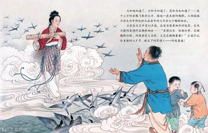 天和地知道了,云和月知道了,花和鸟也知道了……成千上万的喜鹊飞聚到天河,搭起一座美丽的鹊桥。王母娘娘只好允许牛郎和织女在每年的七月初七于鹊桥相会。