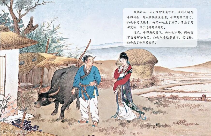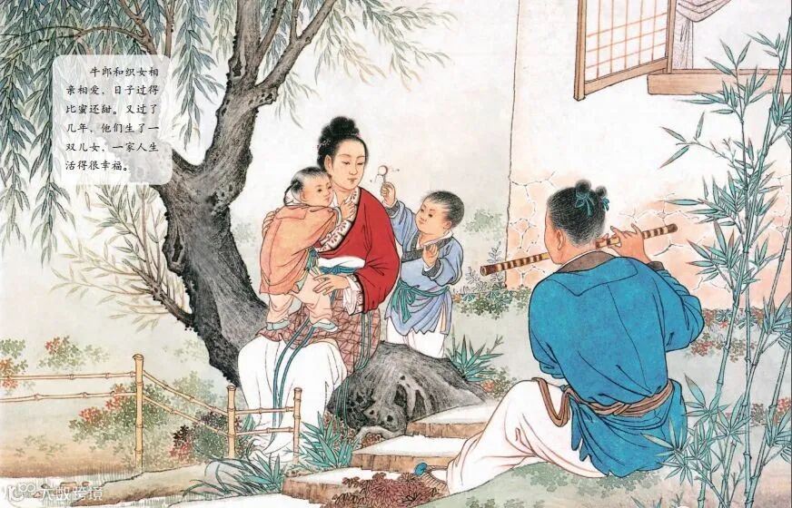 于是,牛郎娶了织女做妻子。他们相亲相爱,男耕女织,生活得非常幸福。日子过得真快,转眼三年过去了,牛郎和织女养育了一儿一女。