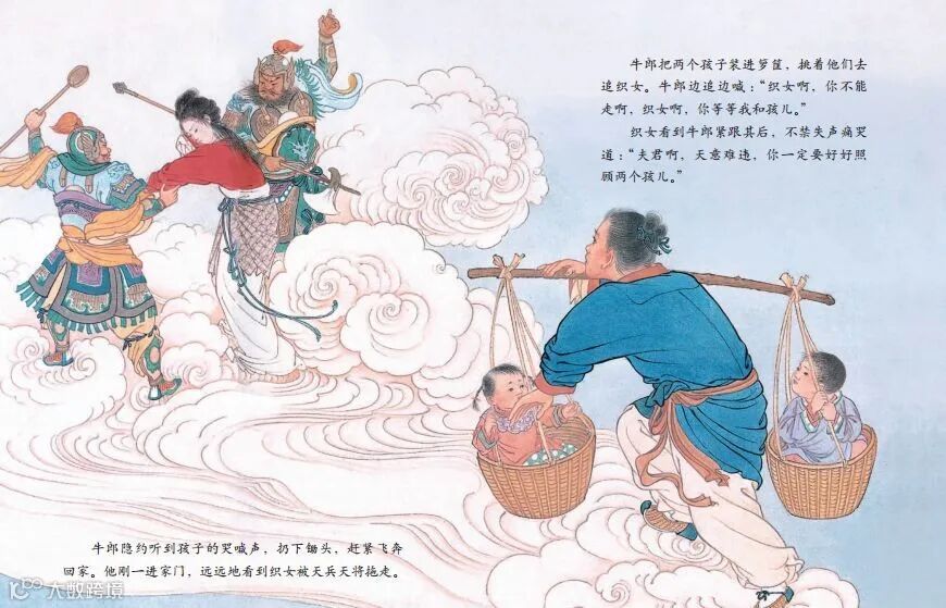 天上的王母终于发现织女私自下凡,大为震怒,派天兵抓走织女。牛郎用担子担着一双儿女,飞上天去追赶妻子。