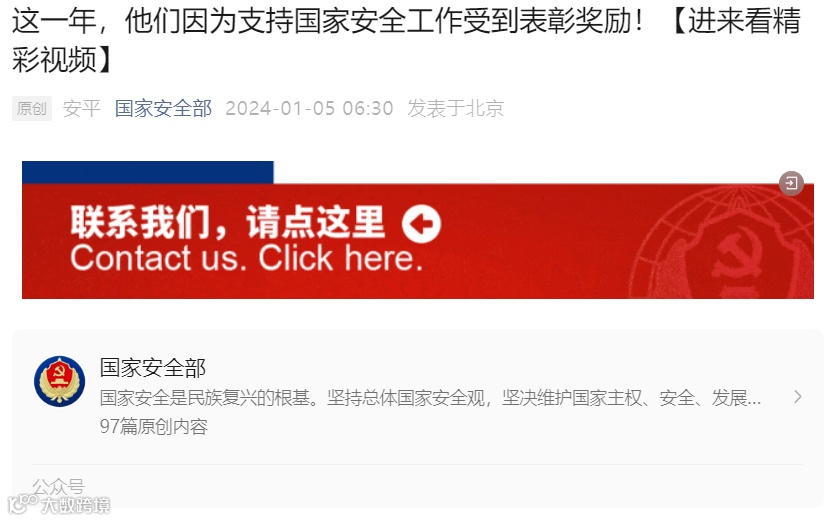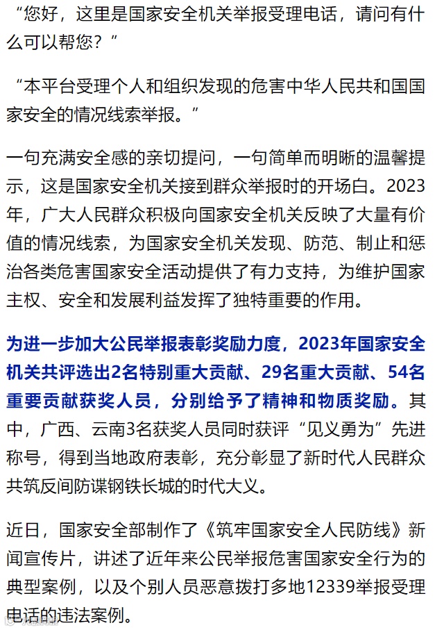 1月5日,国家安全部发文《这一年,他们因为支持国家安全工作受到表彰奖励!》,文中提到“您好,这里是国家安全机关举报受理电话,请问有什么可以帮您?”“本平台受理个人和组织发现的危害中华人民共和国国家安全的情况线索举报。”一句充满安全感的亲切提问,一句简单而明晰的温馨提示,这是国家安全机关接到群众举报时的开场白。2023年,广大人民群众积极向国家安全机关反映了大量有价值的情况线索,为国家安全机关发现、防范、制止和惩治各类危害国家安全活动提供了有力支持,为维护国家主权、安全和发展利益发挥了独特重要的作用。内容如下: