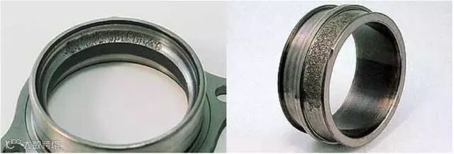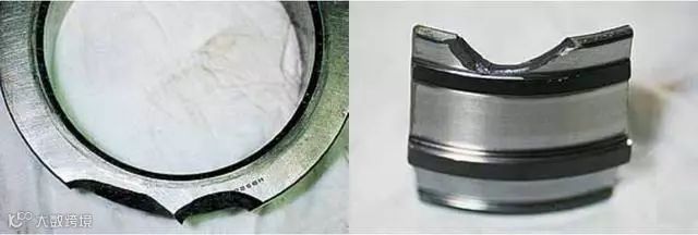 沟道单侧极限位置剥落主要表现在沟道与挡边交界处有严重的剥落环带。产生原因是轴承安装不到位或运转过程中突发轴向过载。