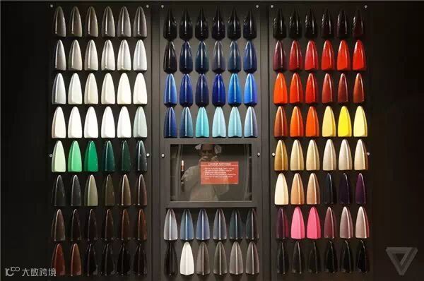 客户几乎可以订做任何颜色的车子。这只是劳斯莱斯提供给客户的一小部分配色选择。每一种颜色都有自定义的名称,如与显示屏中间的唇膏相对应的黛博拉粉色(Debora Pink)。尽管有各种各样的颜色选择,劳斯莱斯80%的订单还是选择传统的黑色、白色或者银色涂料。