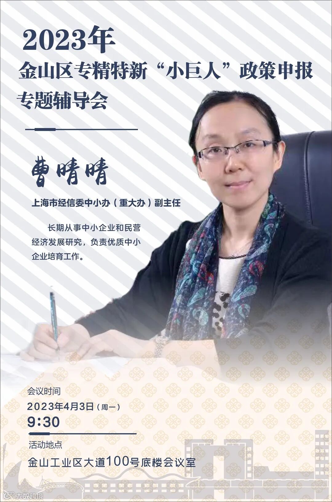 区经委定于2023年4月3日(星期一)上午9时30分,在金山工业区大道100号底楼会议室组织开展2023年金山区专精特新“小巨人”政策申报专题辅导会。本次活动特别邀请上海市经信委中小办(重大办)曹晴晴副主任作现场辅导。曹晴晴长期从事中小企业和民营经济发展研究,负责优质中小企业培育工作。