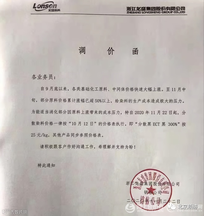 2020年11月22日(周日),浙江龙盛集团股份有限公司发出《调价函》,决定自2020年11月22日起,分散染料价格一律按“10月12日”的价格表执行。即“分散黑ECT黑300%”按25元/kg,其他产品同步参照价格表。并要求各业务积极跟客户作好沟通工作,希理解并支持为盼。