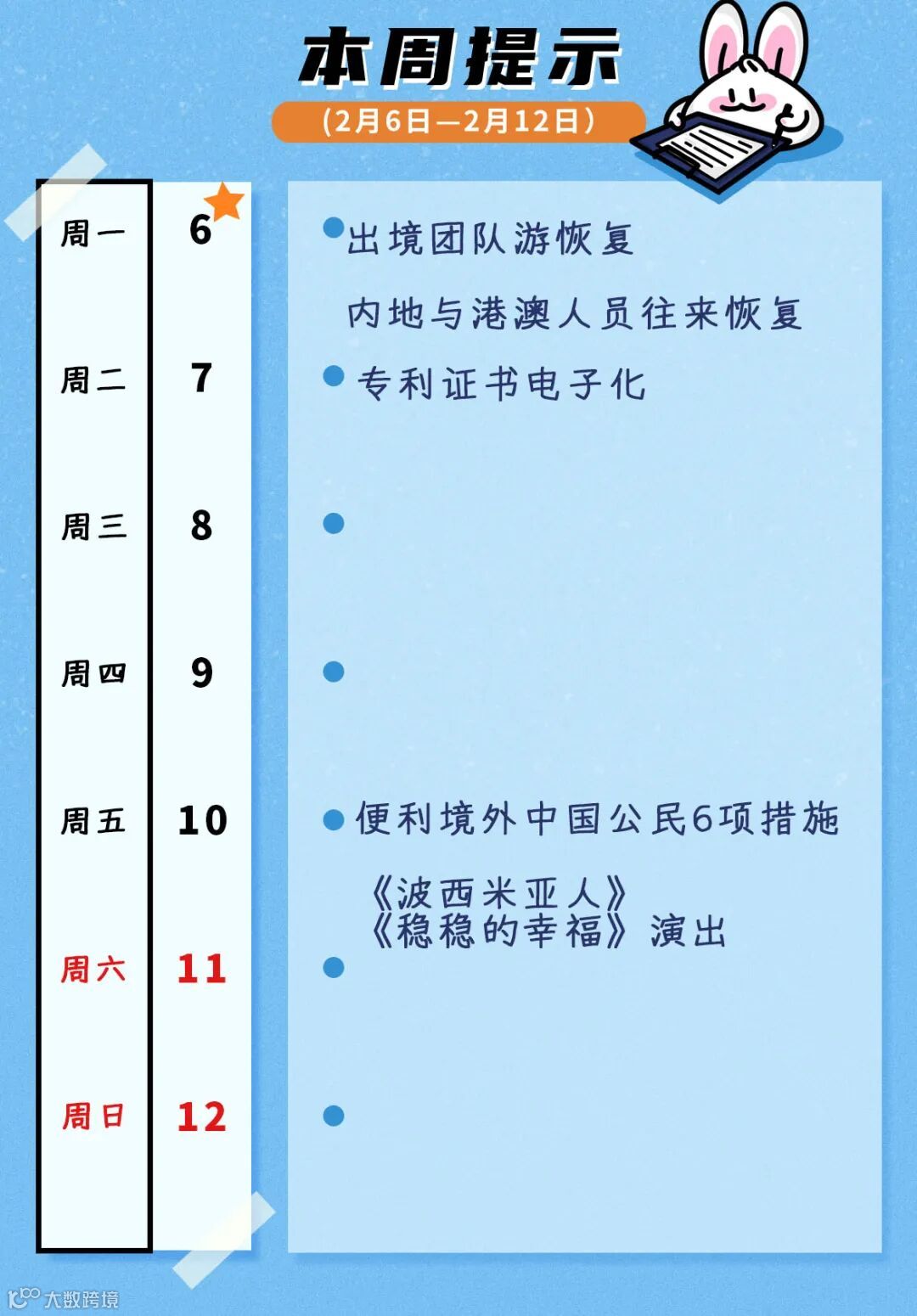内地与港澳人员往来全面恢复,旅行社出境团队游业务试点恢复,春节返岗交通和新能源车置换补贴申请开启,上海“两苗”集中补打2月开始,2022年度“个人所得税经营所得汇算清缴”开始……本周还有哪些大事?速看本周提示↓