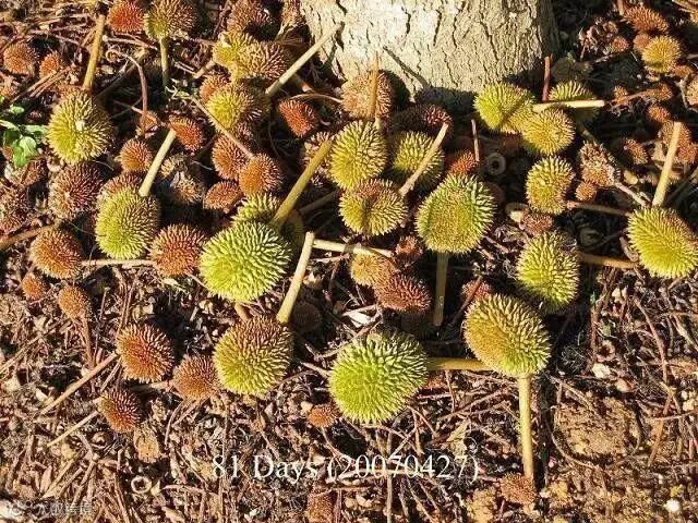 听果农说,榴梿不能采摘,只能等其成熟自动落下,否则果树会受到损伤~