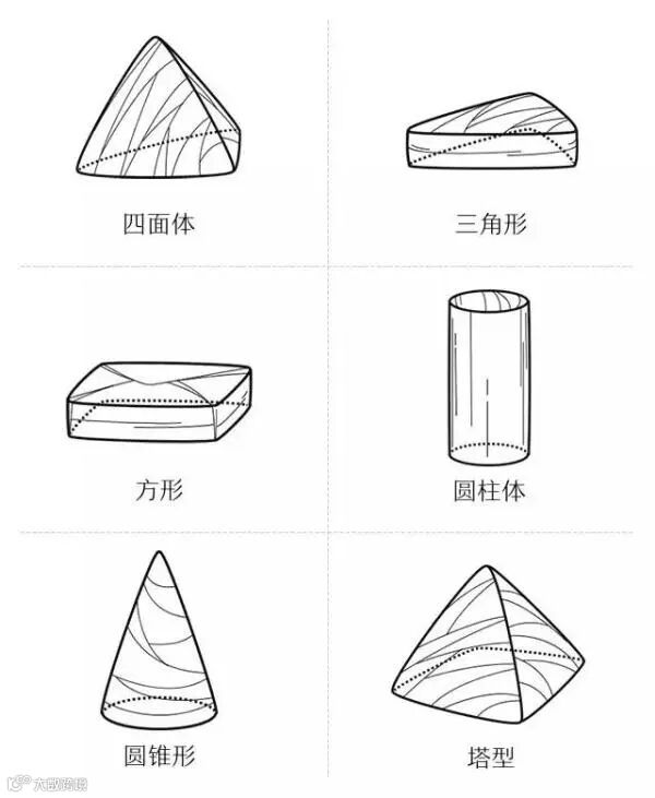 粽子的外形有很多种,早期人们盛行以牛角祭天,因此汉晋时的粽子,多做成角形,作为祭祀用品之一。后来由于人们所选取的粽叶和食材的不同,也出现了筒形、方形、三角形等各种形状。