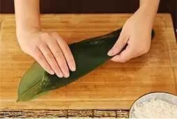 5.顺势将粽叶向下折叠,完全盖住糯米