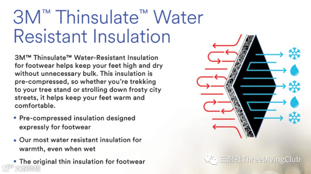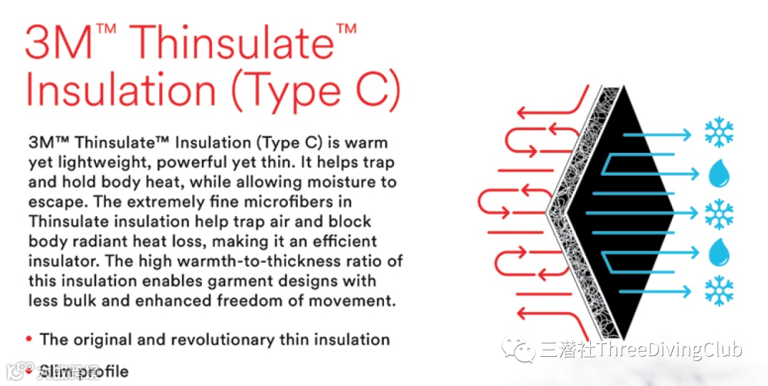 3M公司的Thinsulate 新雪丽保温棉,以其热特性、预压缩绝缘、低吸水性,高透气性。即使是在潮湿的情况下,也能让潜水员保持温暖。