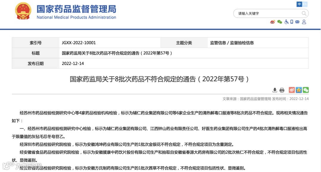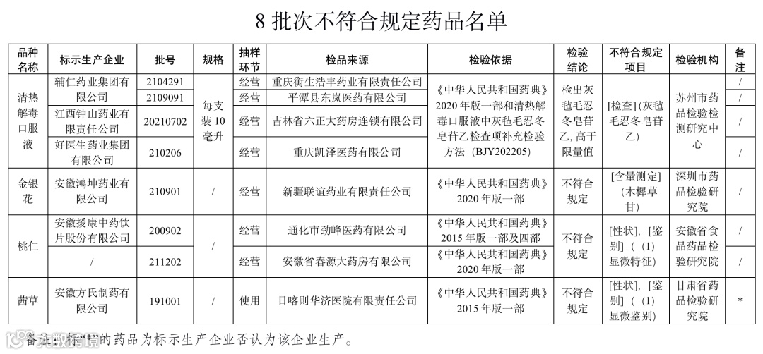 一、经苏州市药品检验检测研究中心检验,标示为辅仁药业集团有限公司、江西钟山药业有限责任公司、好医生药业集团有限公司生产的4批次清热解毒口服液检出高于限量值的灰毡毛忍冬皂苷乙。