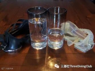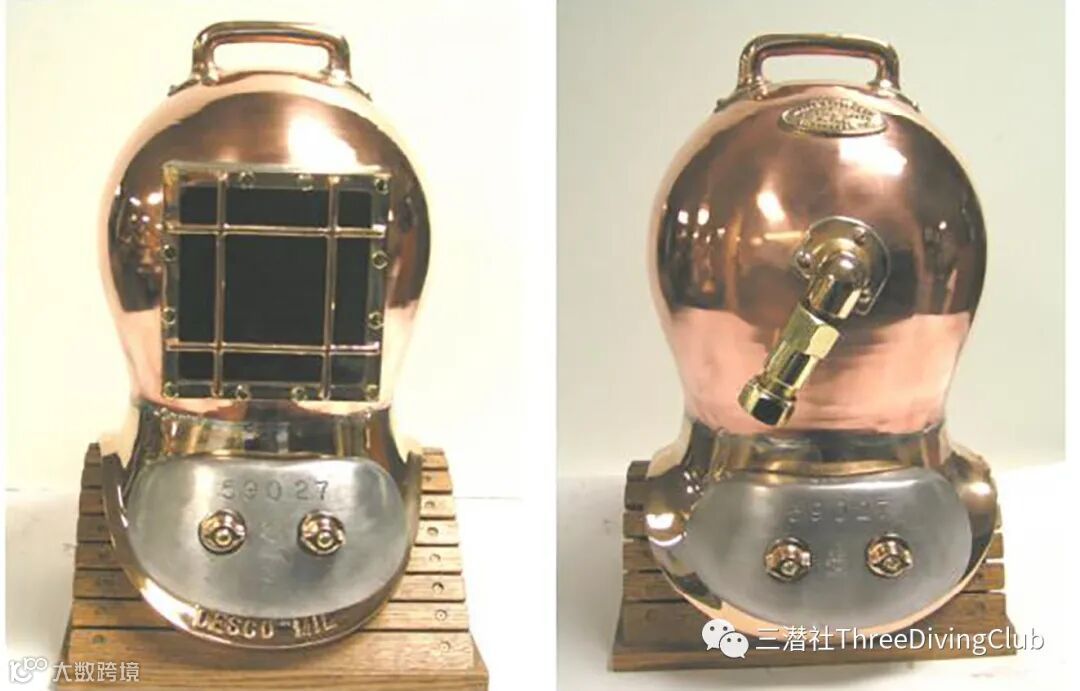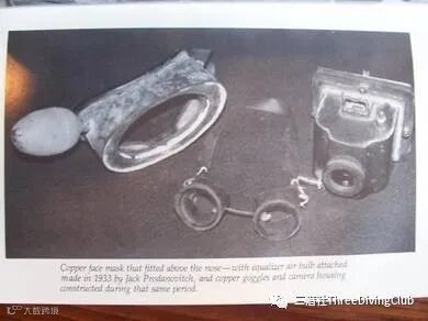 左边是一个有趣的例子,来自卡洛斯埃尔斯的书《最后的蓝水猎人》(The Last of the Blue Water Hunters),早期的单镜片面镜没有把鼻子包裹其中。平衡空腔是通过使用一个小橡胶球蓄气实现的。
