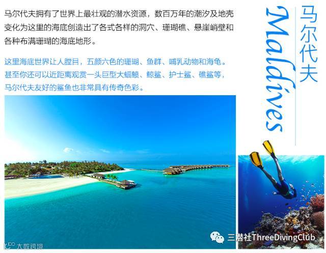 在印度西南方的印度洋中,一座裸露在海面上岛屿以及周围 1200 座小岛汇聚成的环礁使马尔代夫拥有了世界上最壮观的潜水资源。数百万年的潮汐及地壳变化为这里的海底创造出了各式各样的洞穴、珊瑚礁、悬崖峭壁和各种布满珊瑚的海底地形。在马尔代夫的周围散布着成百上千的、生长着各种珊瑚、鱼类、哺乳动物和海龟的、令人惊异的潜水点,这也让马尔代夫成为了世界上顶级的潜水胜地。