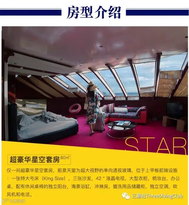 仅一间超豪华星空套房(60㎡)前景天窗为超大视野的单向透视玻璃,位于上甲板前端