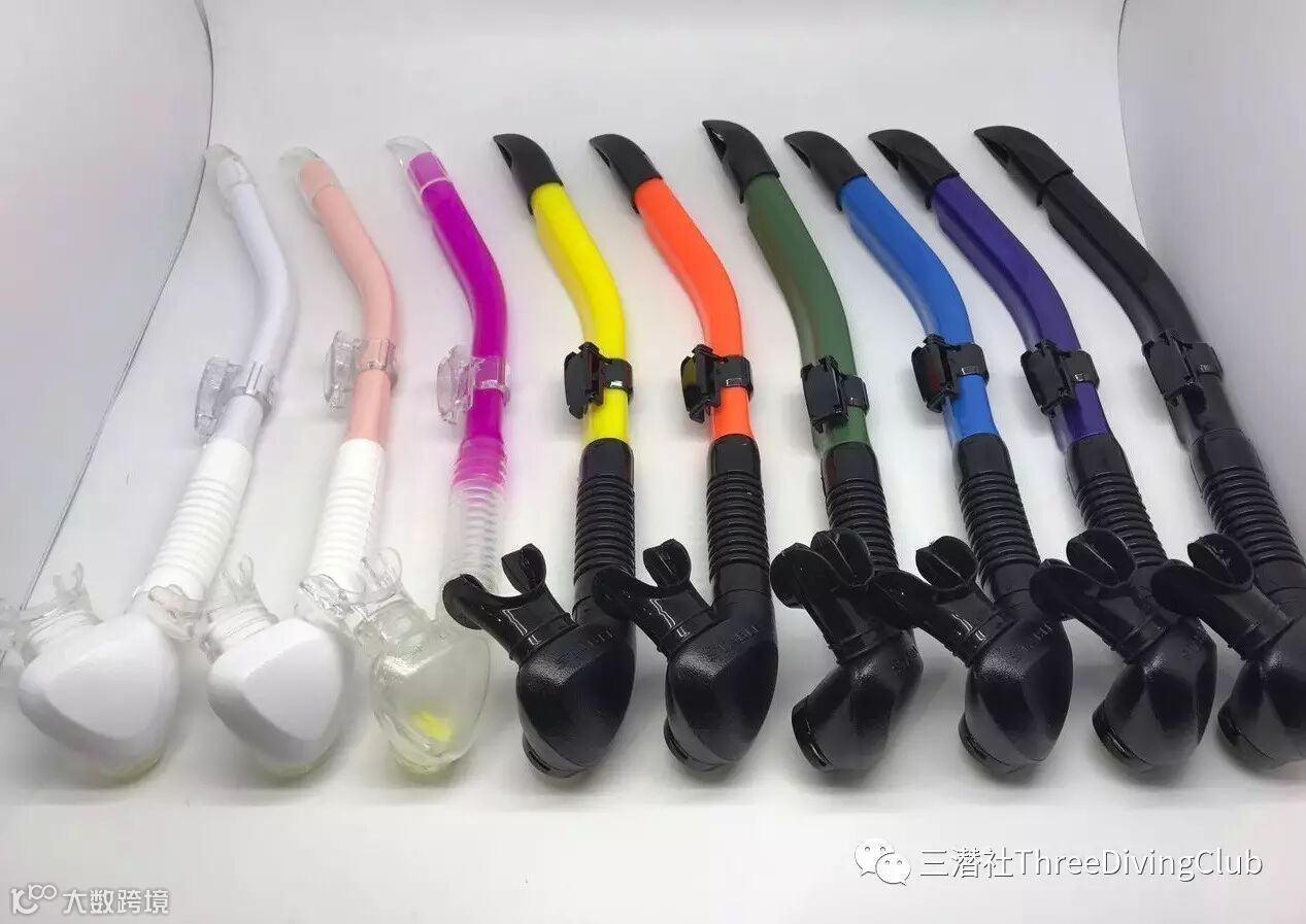 呼吸管主要分为了干管和湿管两种选择,干管最大的特点是在管子的上方有个只允许空气流过阀门,那样当管子沉入水中时水也不会流进管子里,那么也就可以不喝水了。但是也是因为这个阀门,会造成你呼吸需要更大的力度。如果你用的是湿管得话,一个浪打来难免会喝几口水,除非你利用好灵活的舌头(邪恶啊)。建议一般情况下选择购买半干管,最好不要租用,千人骑万人用的,太恶心了。
