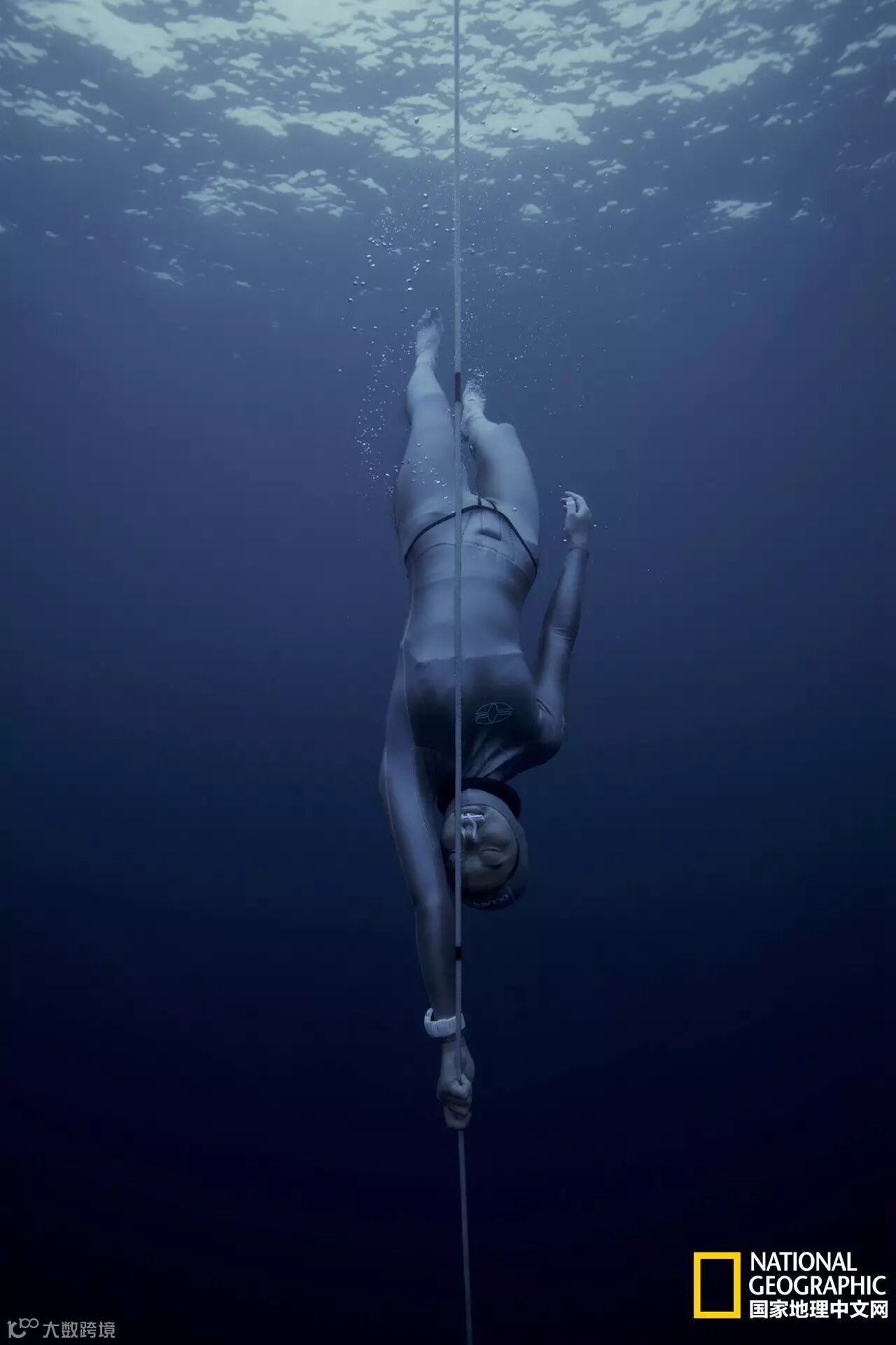 中国自由潜水运动员陆文婕在进行徒手攀绳项目的训练。