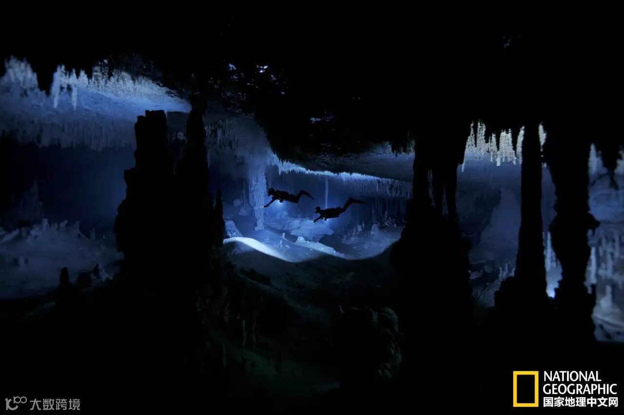 两名洞穴潜水员在探索墨西哥尤卡坦半岛的水下洞穴系统。