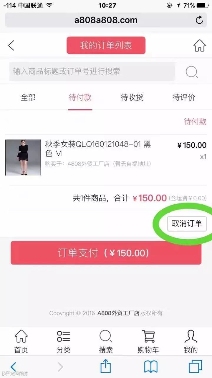 到这里为止,订单已经形成了!无论是否付款,订单都已经在大家的全部订单里出现,如果选错了,请立刻进入“全部订单”里取消!如果大家还有不懂,请立刻关注我们的公众号“A808A808A808”(搜索公众号,记住三个A808!)像在微信里跟其他朋友聊天一样跟公众号说句话,我们的客服就会回复你哦!让我们一起展开一段不出门的购物发现之旅吧!