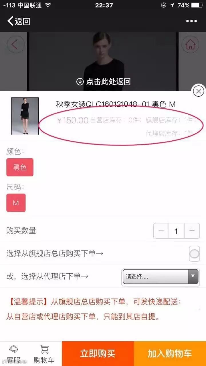 2,点击之后会看到一个选择框,你所选择的商品在选择框的最上端会显示各个店铺的库存总量(图二);