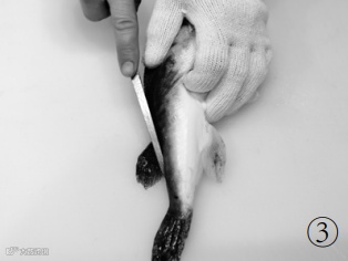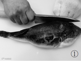 1.沿胸鳍根紧贴鱼体,自上向下切除左胸鳍:2.同上方法,切除右胸鳍;3.从后侧沿背鳍根紧贴鱼体切除背鳍;4.鱼体腹部向上,从后向前紧贴鱼体切除臀鳍。