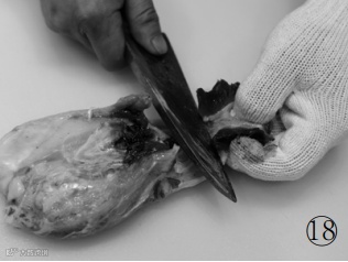 18.沿鳃盖骨分离出鳃;19.分离黏膜;20.分割鱼舌;21.分离肝脏等其他内脏器官;