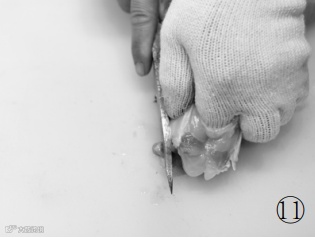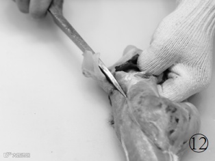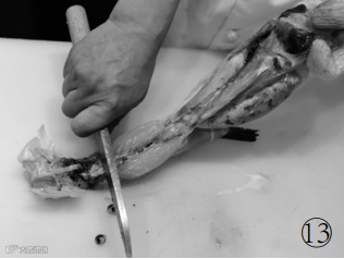 12.沿鳃盖骨分离出鳃;13.切断鳃弓,使鳃、舌与内脏相连。分割内脏与肌肉连接部分;