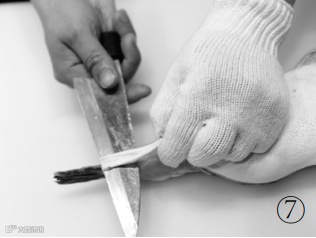 5.从鳃部将鱼皮切开;6.刀刃向上,沿背、腹分界线从头部向尾部将皮切割,勿伤肌肉;7.分离背皮与尾部连接处;8.用刀压住鱼尾向头部方向拉皮,使背皮与鱼体脱离;9.同样方法剥下腹皮;