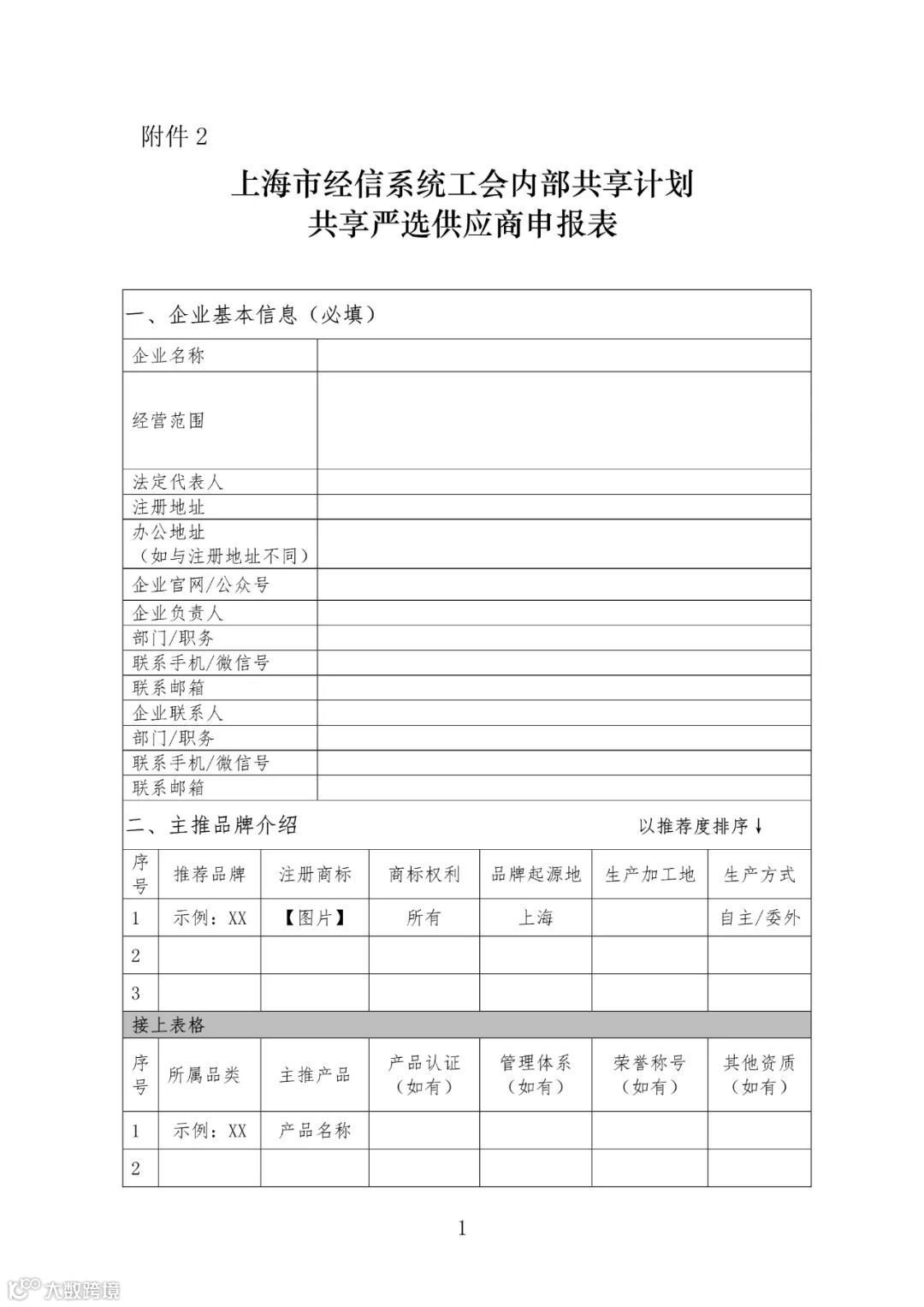 附件2:上海市经信系统工会内部共享计划共享严选供应商申报表