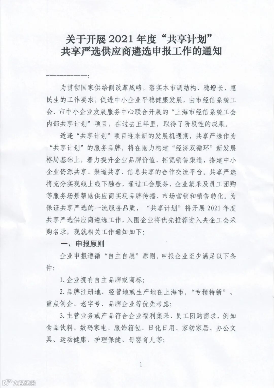 附件1:关于开展2021年度“共享计划”共享严选供应商遴选申报工作的通知