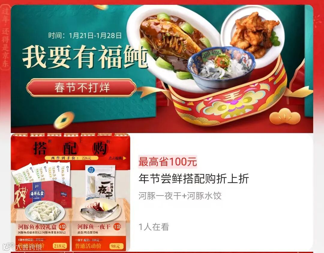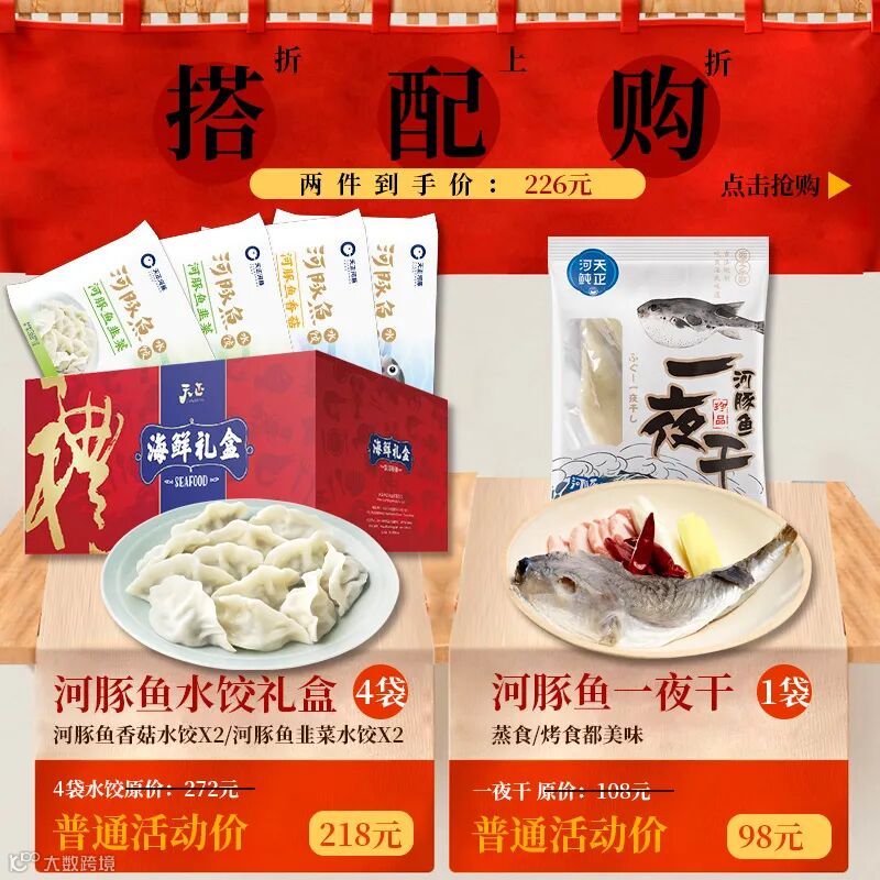 普通活动价218元的水饺礼盒+98元河豚鱼一夜干,春节搭配购活动价:226元。