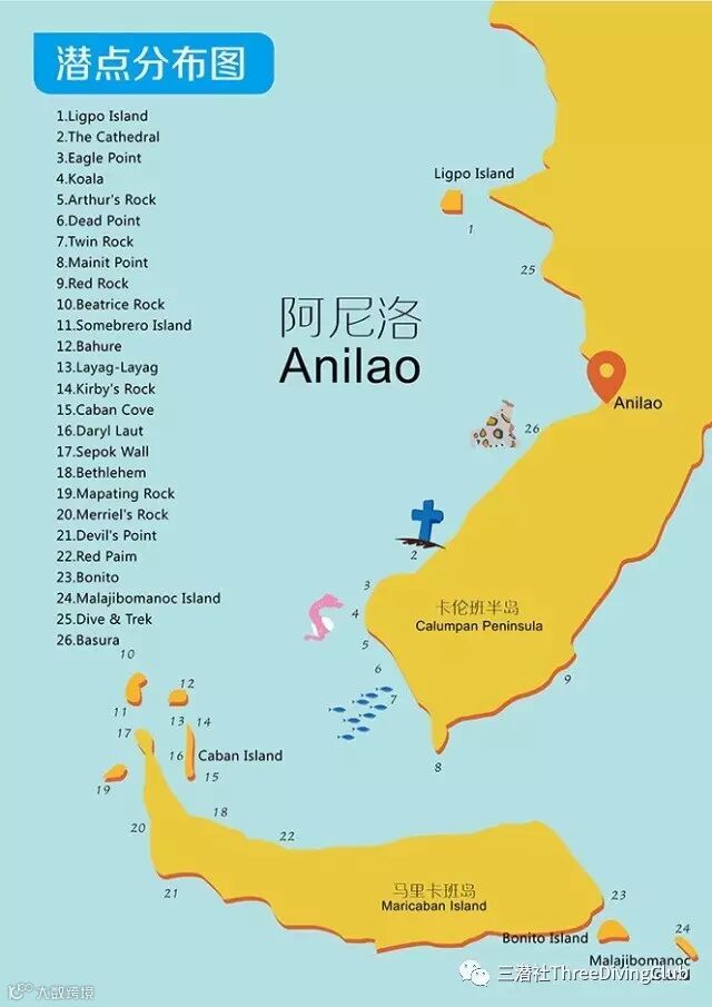 阿尼洛(Anilao)位于菲律宾吕宋岛的卡伦潘半岛八打雁湾(Batangas Bay),是距离马尼拉最近的潜水地,也是菲律宾潜水早期的发源地,从马尼拉机场开车只需要2-3 小时即可抵达。阿尼洛以“垃圾潜水“闻名,那里小东西特别多,是菲律宾的微距天堂。