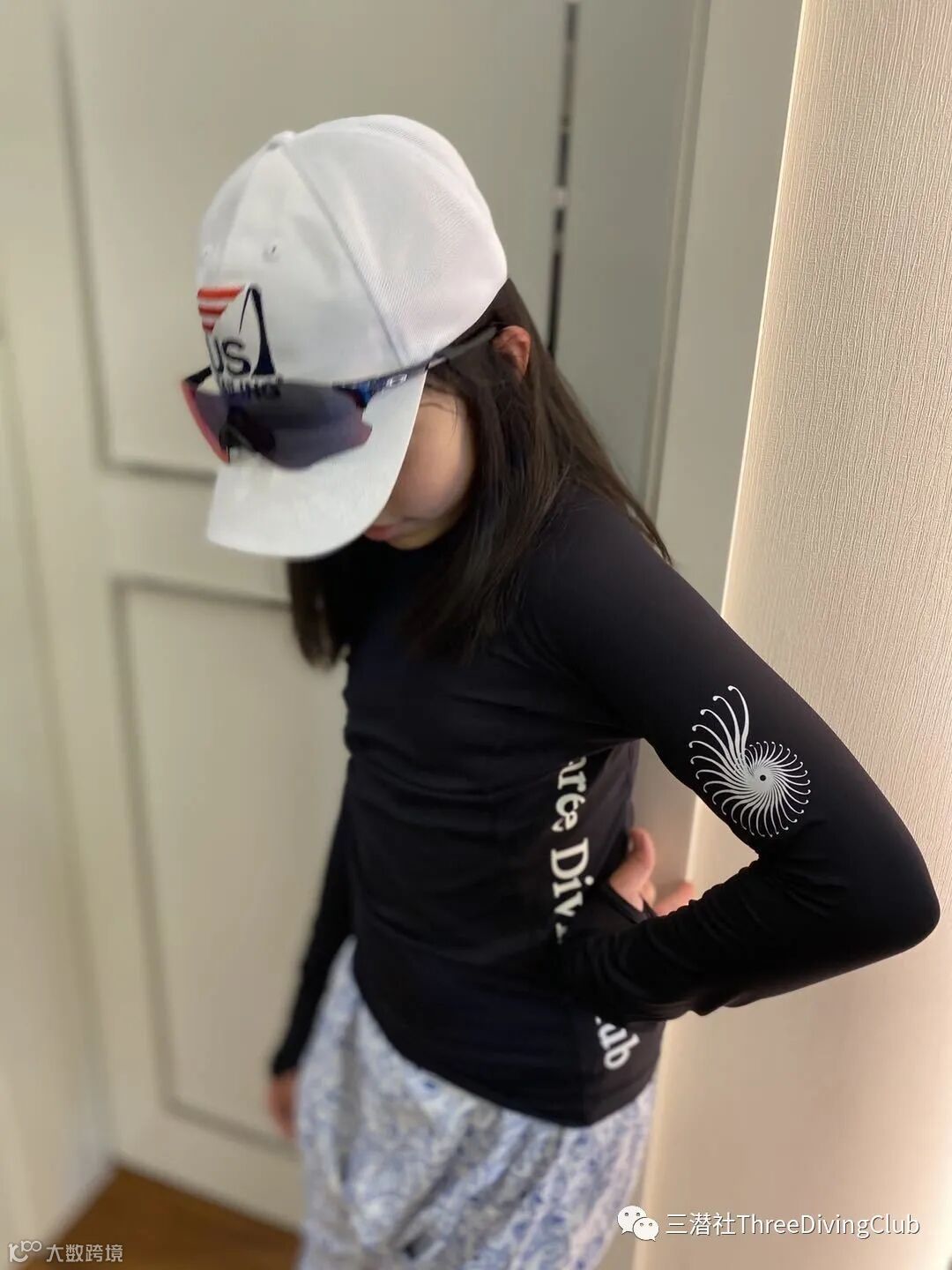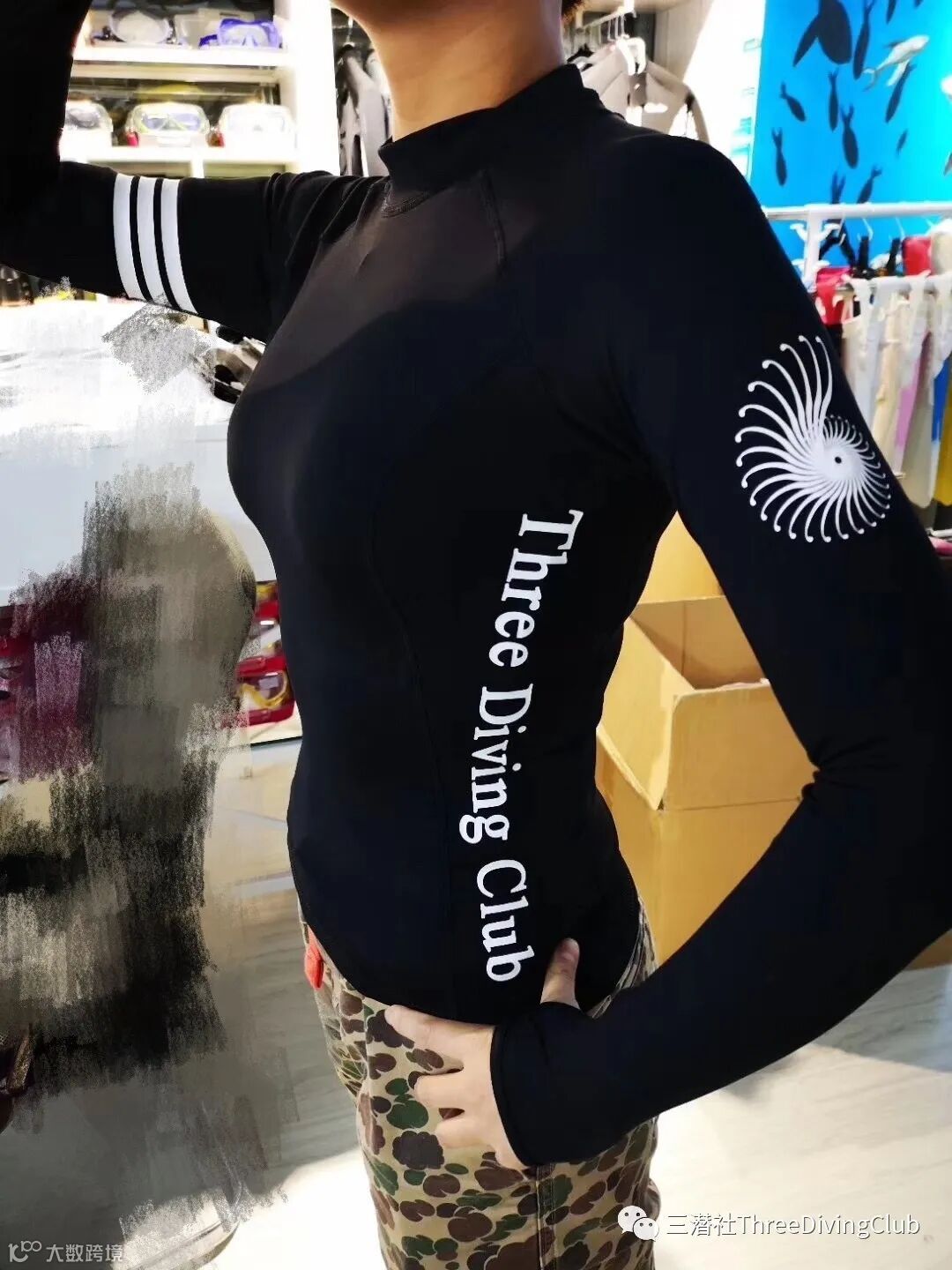 三潜社湿衣的尺码涵盖了男女,各种尺码,连儿童款也毫不马虎,衣服分为黑白两款,黑款侧边和肘部为白色logo字,白色款侧边和肘部为墨水蓝logo字。