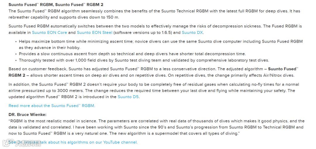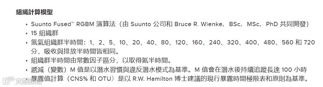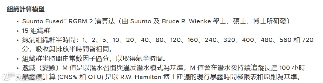 同时也注意到了D5使用了完全不同于前任的组织计算模型Fused RGBM2演算法,Suunto的对此诠释是“优势在于,能够适应各种各样的情况,因而提供额外的安全性”。“Fused™ RGBM 2 在深水空气潜水方面保守程度降低,从而实现更短的上升时间。此外,此算法在计算禁飞时间时不再要求人体组织完全排除残余气体,从而缩短了上次潜水与飞行之间的规定时间”。"Suunto Fused™ RGBM 2 的优势在于,能够适应各种各样的情况,因而提供额外的安全性。对于休闲潜水者,它可以提供略长的免减压时间,具体取决于所选的个人设置"。
