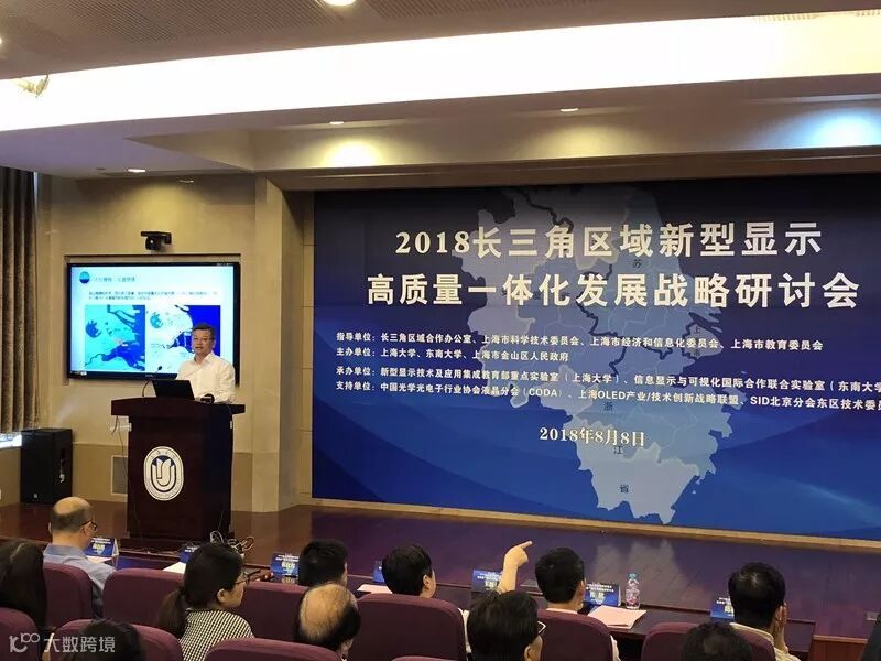2018年8月8日上午,“长三角区域新型显示高质量一体化发展战略论坛”在上海大学顺利召开。此次论坛由上海大学、东南大学、上海市金山区人民政府主办,来自上海、江苏、浙江、安徽新型显示战略性新兴产业领域的高校、科研机构和产业链上中下游等50余家单位120名嘉宾应邀出席,上海市科学技术委员会副主任干频、金山区人民政府张权权副区长出席本次论坛并致辞。