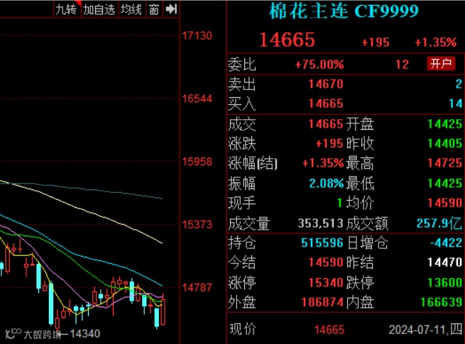 部分涉棉企业、机构认为,郑棉虽然空头仍占据上风,主力合约盘面大概率回试14500元/吨甚至前低14340元/吨,但已不具备深幅下挫的条件,因此有逢低入场、提前低价锁定棉花资源打算的用棉企业不在少数(不考虑7-9月份天气变化对2024/25年度新疆棉单产、总产的影响)。7月11日,郑棉主力合约收14665元/吨,涨195元。