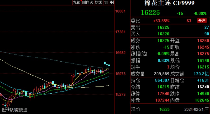 春节期间,郑棉休市,国内棉花现货横盘僵持,但外棉走势偏强,回顾2月7日,美棉主连收于88.54美分/磅,而至本周五,ICE美棉主连已收于94.42美分/磅,结束80-90美分/磅之间震荡整理趋势。且节后涤纶短纤、粘胶短纤亦有走高,棉花在外围及竞品带动之下释放偏强信号。2月21日,郑棉主力合约收16225元/吨,跌15元/吨。