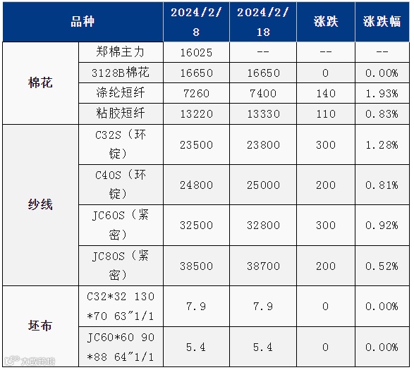 纯棉纱企业年前涨幅有限,节后陆续复工复产,近期报盘稳中有涨,前期低价收紧上扬,区间重心上移,部分纱支涨幅在200-300元/吨,另有部分纱支报盘涨幅在500元/吨附近或更高。