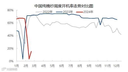 春节前下游织造企业、棉纱贸易商积极补库,棉纺企业棉纱库存明显去化,2月9日-2月15日,国内纱企大部分停工放假,样本企业开工水平最低曾至3.33%左右,但在此期间,部分新疆企业及内地个别企业,春节期间仍在正常生产。年后初三至初六,德州、新乡部分生产精梳紧赛纱线企业开工较早,大部分企业初八或之后才陆续开工,至2月18日,样本企业纱线开工水平回升至15.35%左右,未来一周将是纱厂集中开工的时间段,行业开工水平将急剧上升,陆续回归正常水平。