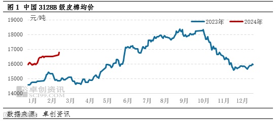 春节假期后,随着产业链上下游企业陆续复工复产,国内棉花购销开始启动,价格上涨。据卓创资讯监测, 2024年2月19日国内3128B级皮棉均价16800元/吨,较2月9日涨308元/吨,涨幅1.87%。展望后市,影响棉花价格走势的关键因素较节前变化不大,仍然聚焦在需求恢复、新年度植棉面积变化以及供应端压力缓解等方面。
