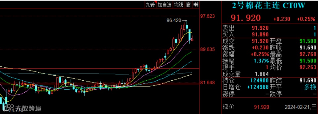 美国期货分析人士表示,近期棉花市场并没有明显的看多因素,而资金却持续拉高盘面,成交量和持仓量均放出天量,这种异乎寻常的表现很难解释,或许是资金获悉了市场所不了解的情况。直到2月18日美国国家棉花总会(NCC)发布意向植棉面积。根据NCC的调查,2024年美棉意向面积为980万英亩,同比减少3.7%,这与之前《棉农杂志》以及USDA农业展望论坛的预测相差不小。此前,国外分析人士普遍认为,此次棉价上涨速度过快,从技术图形上看已接近行情的最高点,预计在95-96美分会有较强阻力。2月20日,随着NCC美国意向面积下降这个意料之外的利多因素兑现,2月20日,ICE期货开盘后便大幅回落,截至2月20日下午已下跌200余点,最低跌至92美分一线。