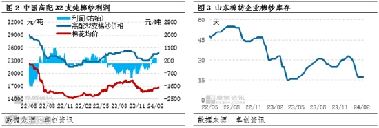 据卓创资讯监测,2月上旬棉纱库存为17天,较去年同期下降15天。随着库存下降,棉纱价格上涨,从1月中旬棉纺企业开始扭亏为盈,2月上旬,纯棉普梳环纺高配32支棉纱的理论平均利润维持在368.79元/吨。春节后首个工作日棉纱价格上涨300元/吨,产业链价格传导较顺畅,加工利润小幅提高。基于加工利润修复且棉纱库存处于低位水平,纺企表现出比较高的开工积极性,预计2月下旬开工负荷将快速提升,3-4月份有望维持在高位,棉花需求支撑将增强。
