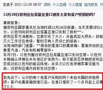 福步论坛网友:叙利亚老客户采购的两个来自中国的货柜,到港口后堆积了一个多月,赶上了这个事,货柜在爆炸中受损!