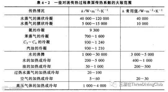 开始失温并不意味着马上冷到和周边一样,所以关于失温的速度,由公式:Φ=AhΔt,给出解释,其中Φ为传热功率(又称热流量、传热速率;是指在单位时间内通过传热面的热量),A为传热面积,h为物质的对流传热系数,Δt是温差,其中h的意思和我们OW里所学“水吸收热量的速度是空气的20倍”这个概念差不多,又叫表面传热系数,看下面的表。