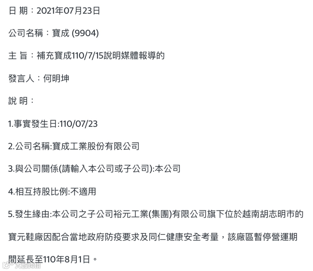 本公司之子公司裕元工业(集团)有限公司旗下位于越南胡志明市的宝元鞋厂因配合当地政府防疫要求及同仁健康安全考量,该厂区暂停营运期间延长至2021年8月1日。